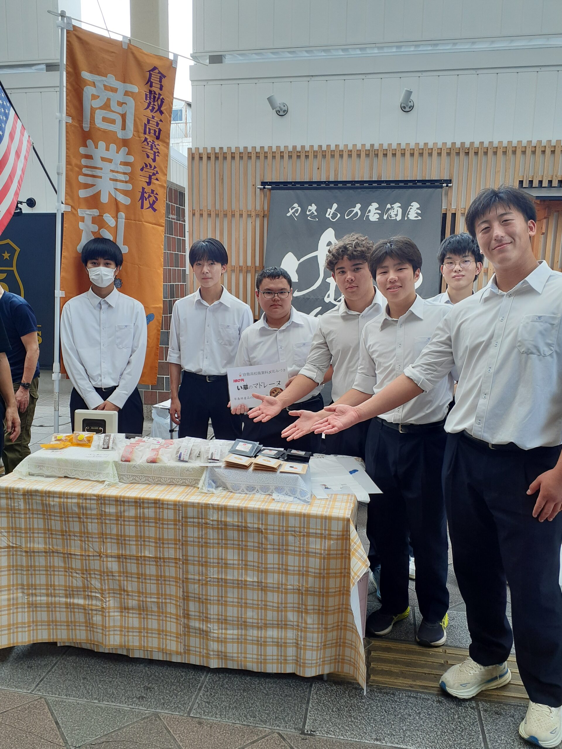 9月15日(日)、倉敷駅前商店街で行われた高梁川流域倉敷三斎市に倉敷高校商業科生徒が出店をしました。早島町はなみずきとのコラボ商品「いぐさマフィン」、そして和洋菓子玉利軒の商品を販売しました。また、玉島の老舗菓子処ひらいの店舗でも商品販売のお手伝いをしました。倉敷高校商業科では学校の座学学習のみならず実習形式の学習活動も大切にしています。だからこそコミュニケーション力と協調性が育めるわけです。次回は10月20日(日)に同じ場所で三斎市出店をします。どうぞお立ち寄りください。