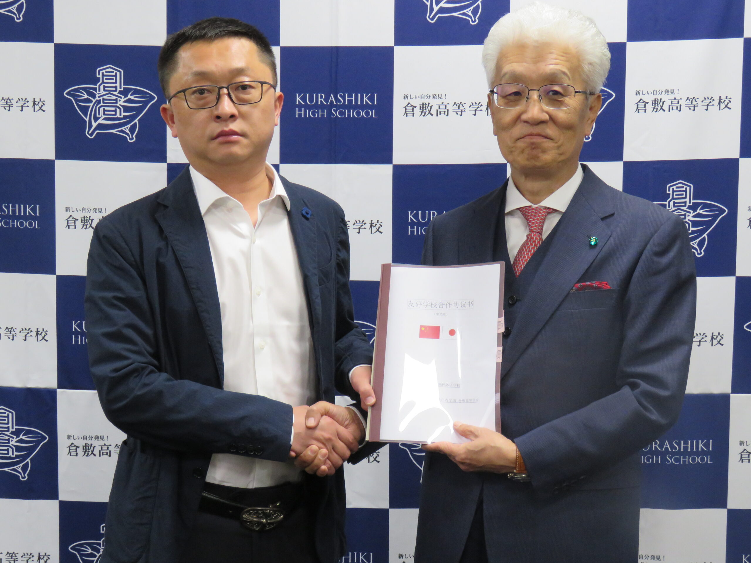 4月25日、中華人民共和国の山东省郓城照昕外语学校との教育連携に関する包括協定の調印式を執り行いました。その後の授業見学では留学生が勉学に励む姿を視察して頂きました。倉敷高校は地域のみならず世界にも開かれた教育活動を展開していきます。