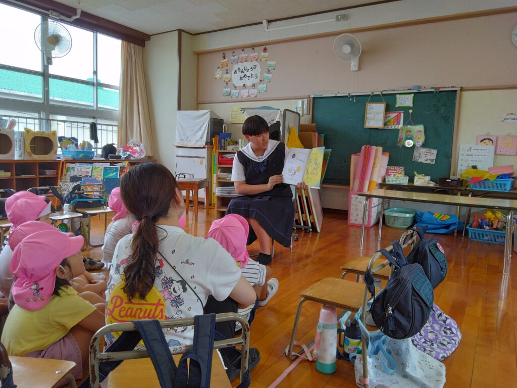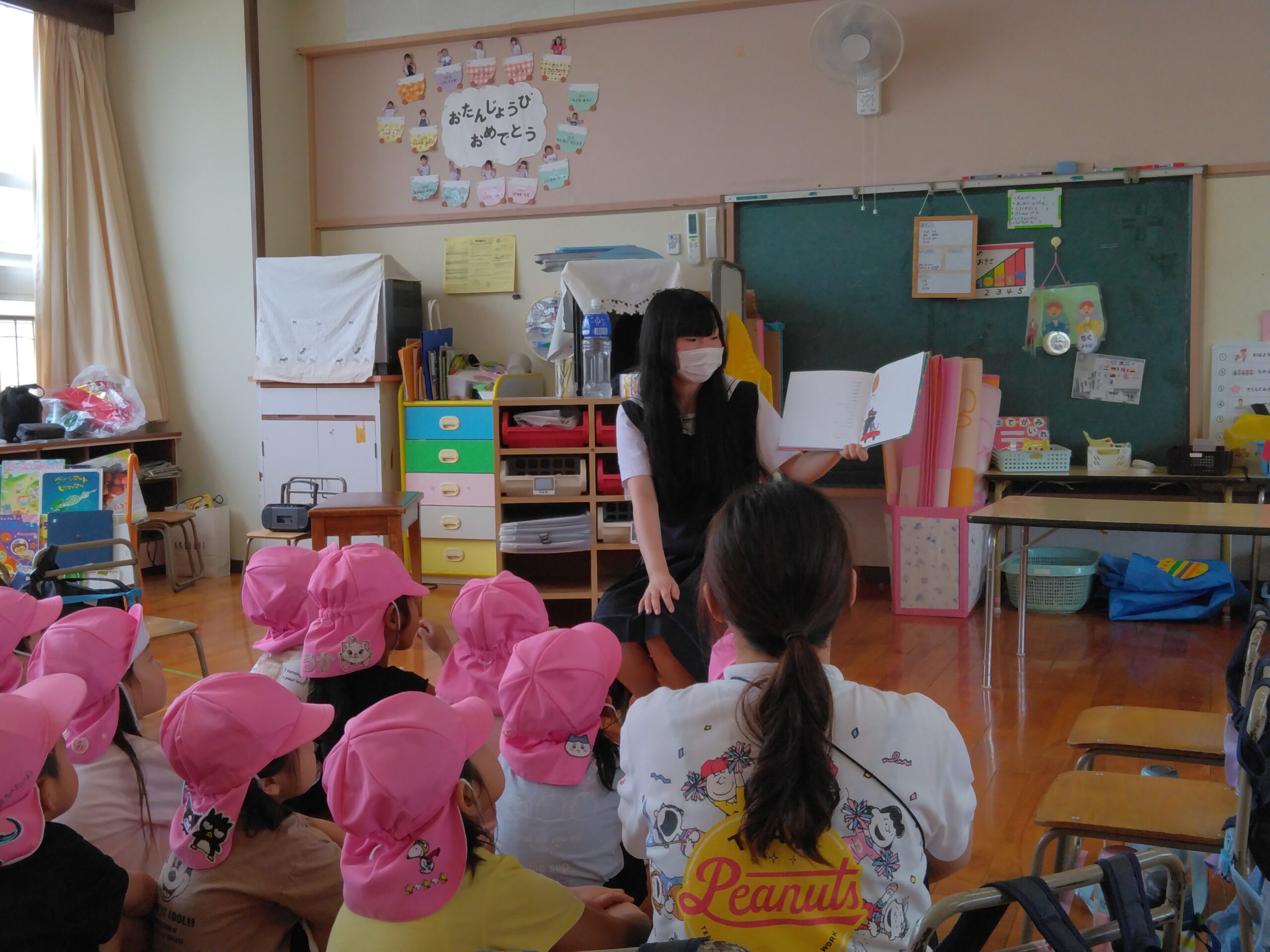 9月28日(木)に普通科総合探究コース・こども保育系の3年生の生徒が倉敷市立中庄幼稚園へ出向いて、読み聞かせボランティア活動を行いました。本校の生徒が優しくゆっくり丁寧な語り口調で、園児たちを物語の世界へ引き込むことができたようです。読み聞かせを通じて子供との触れ合いの時間ができ、信頼関係の構築を築くことができたようです。倉敷高校では職業観を育むための実学的な取り組みとして、実習を多く取り入れたカリキュラムとなっています。
