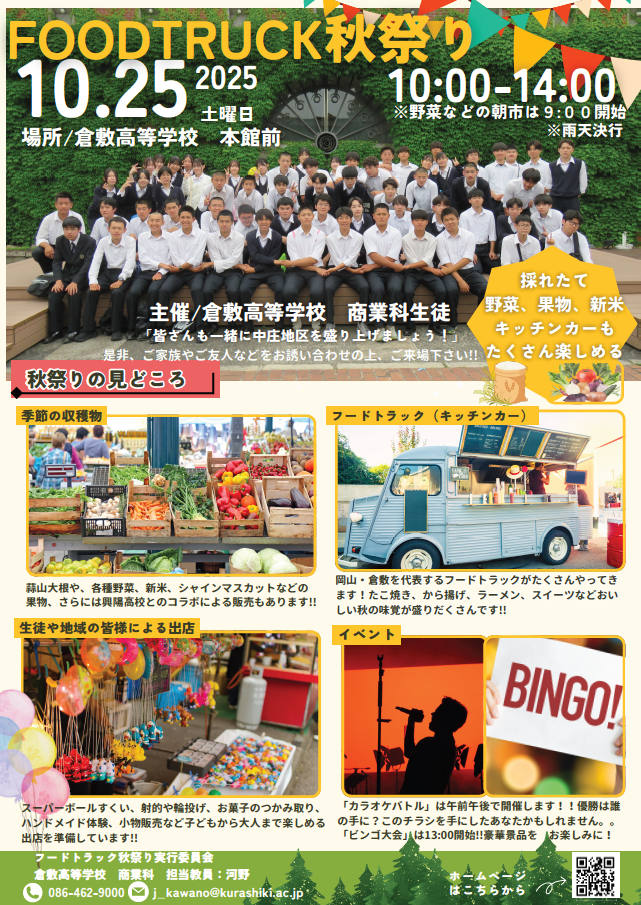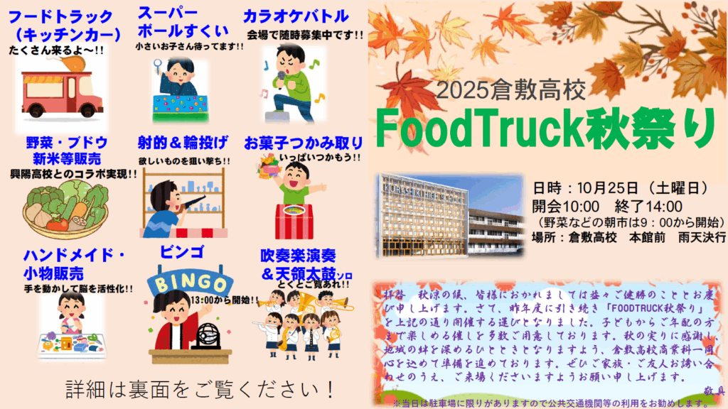 10月25日(土)に「商業科ミニオープンスクール&秋祭り」を行いますが、FoodTruck秋祭りの詳細のチラシとなります。倉敷高校商業科の魅力が詰まったミニオープンスクール&秋祭りはキッチンカーの出店など、在校生主催の地域を盛り上げる取り組みになりますので、多くの皆さまのご参加をお待ちしております。