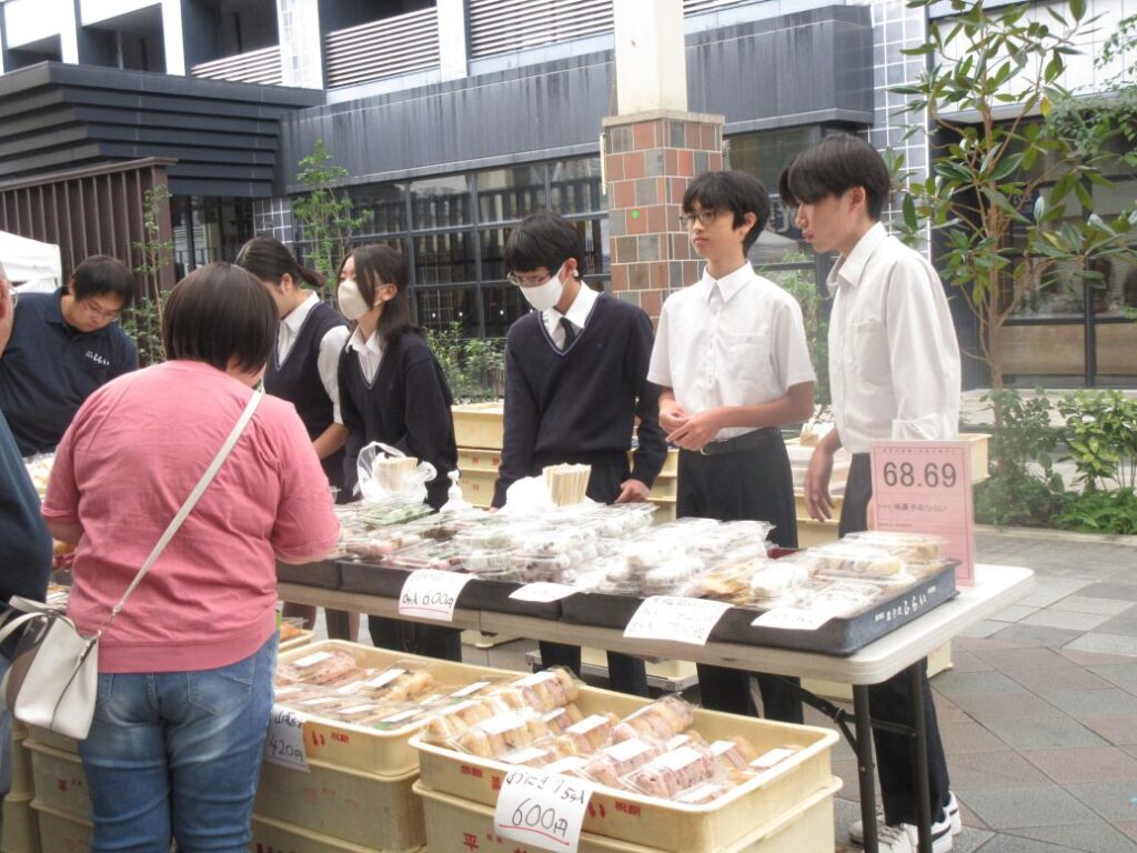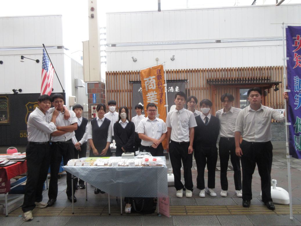 10月19日(日)に倉敷駅前商店街で行われた、高梁川流域倉敷三斎市に商業科の生徒が出店し、「花みづき」さんとのコラボ商品と、笠岡の老舗和洋菓子店「玉利軒」さんの商品を販売をしました。先月に続き、老舗和菓子店「菓子処ひらい」さんのブースにも販売のボランティアをさせていただきました。今回は、フルーツパフェ大福、いぐさのマドレーヌ(チョコチップ・レーズン)・瀬戸内レモンケーキ・フィナンシェ・ロールカステラを販売しました。8時から販売を開始して、小雨のためお客様は最初少なかったですが、途中から雨もやみお客様も増えてきて開始1時間40分で販売は終了しました。