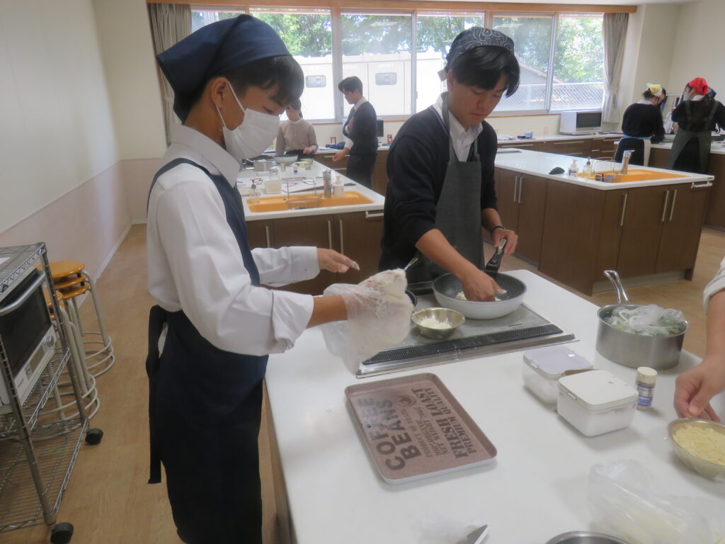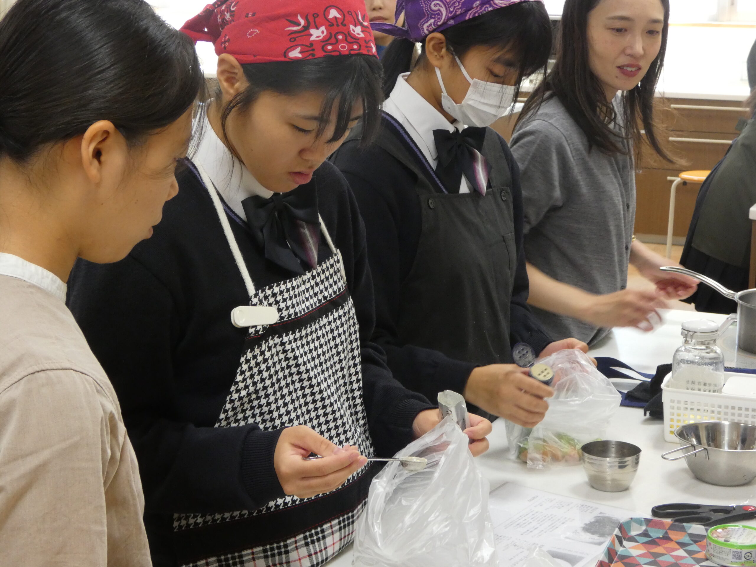 普通科総合探究コース・調理領域の3年生が調理実習の授業で災害時を想定した調理実習として、むろいのりこ先生にご指導いただき,ポリ袋を使った調理方法を学びました。実は、ポリ袋を使えば少ない手順・時間で簡単にピザが作れてしまうんです。今回は、すぐに作れる、ポリ袋を使って生地を作るピザと簡単にできるポトフを作りました。倉敷高校では職業観を育むための実学的な取り組み(実習等)を多く取り入れたカリキュラムとなっています。