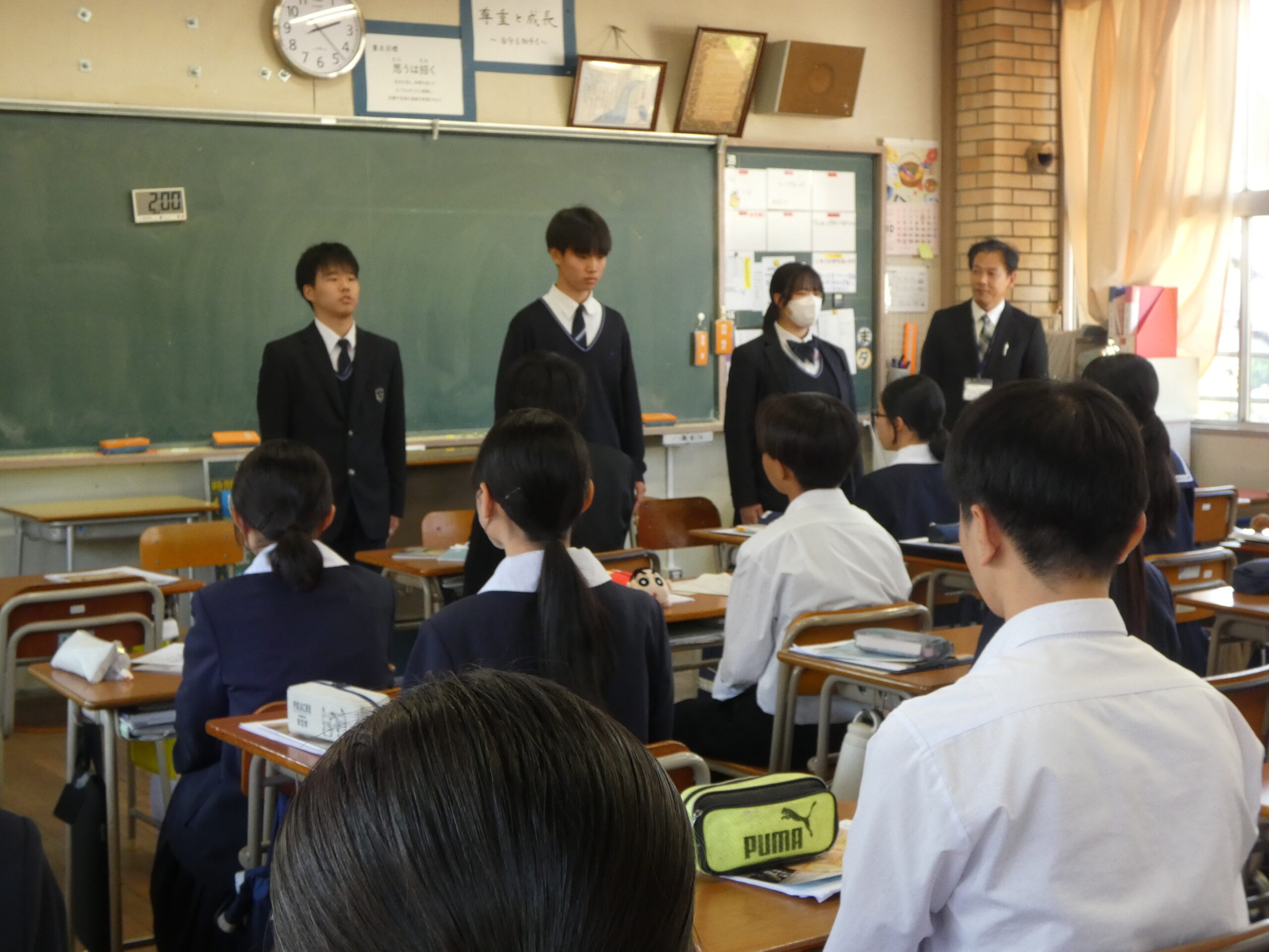 10月30日(木)に倉敷市立東中学校3年生の生徒を対象に「出前授業」で高校入試に向けた面接指導と実践を行いました。講師役は倉敷高校3年生の生徒です。面接の心構えからはじまり、お辞儀の角度から、椅子の座り方、声の大きさまできめ細かく丁寧に教えていました。本校生徒にとっても就職・進学に向けて自ら何度も面接練習した成果が今回の出前授業でも発揮されており、将来に向けて、とても良い経験になったと思います。東中学校の3年生のみなさん、ありがとうございました。倉敷高校は地域との交流を通じて、常に身近な存在でありたいと思います。がんばれ東中学校のみなさん!