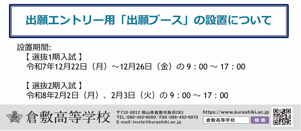 倉敷高校志願者(選抜1期入学試験)でご家庭にインターネット等の環境が整っていない、またはWebエントリー(出願)の手順に不安があるなどの方向けに倉敷高校内に特設「エントリー(出願)ブース」を設置致します。本校のスタッフがサポートしますのでご安心して入学試験への準備ができます。どうぞご利用ください。なお、ご利用をご希望される場合は事前に申し込みをお願いいたします。