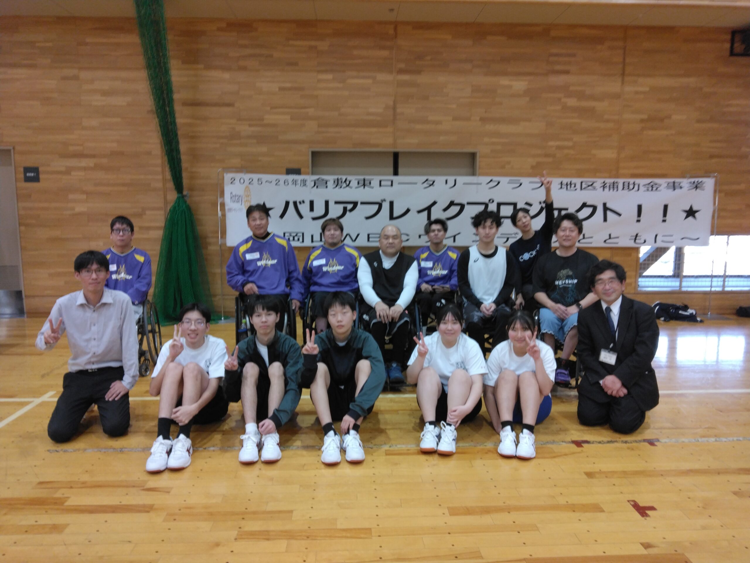 11月29日(土)、くらしき健康福祉プラザで行われた倉敷東ロータリークラブによる、バリアブレイクプロジェクト車いすバスケットボール体験会~岡山WBCウィンディアとともに~に、本校インターアクトクラブの1年生5名が参加し、受付や準備などのボランティアを行うと同時に車いすバスケットボールの体験に参加させていただきました。今回の体験を通じて、リーダーシップ、国際的感覚、そして他者への思いやりを育むことができた有意義な活動になったと思います。
