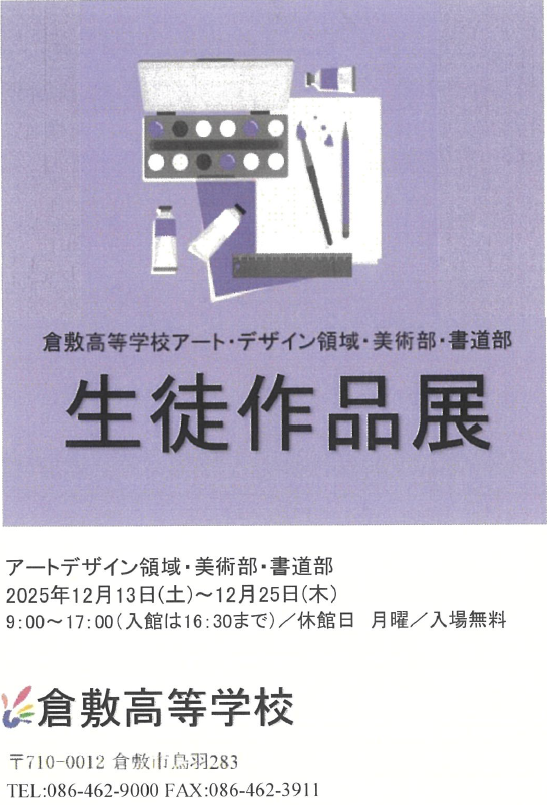 12月13日(土)から12月25日(木)までアート・デザイン領域/美術部/書道部 生徒作品展を加計美術館(倉敷市中央1-4-7:美観地区内)にて開催をしております。*月曜日休館 入場無料 9:00~17:00(入館は16:30まで)