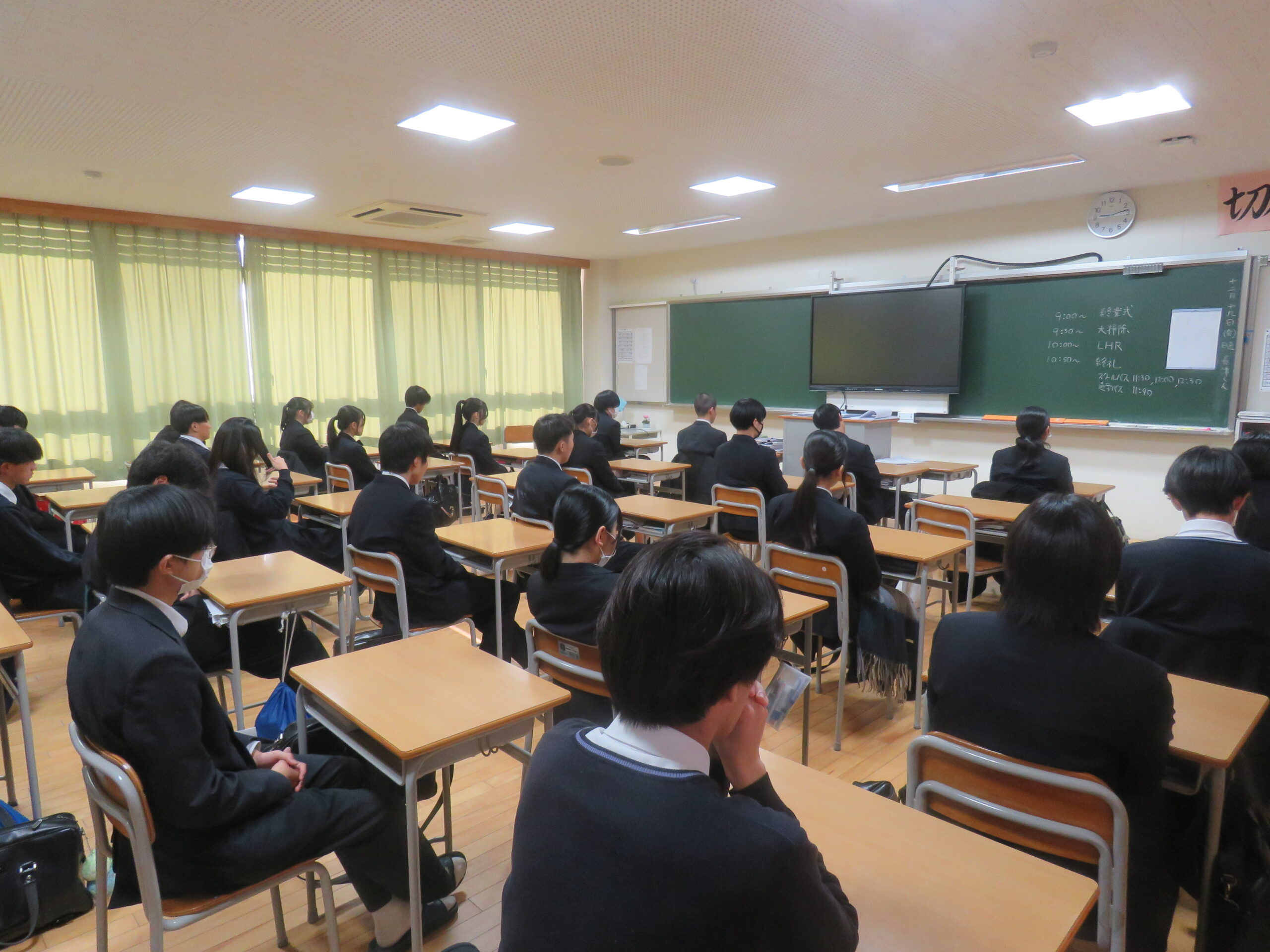 12月19日(金)、2学期終業式が挙行されました。各ホームルーム教室での式となりました。学校長挨拶、生徒会長挨拶、冬期休業期間中の過ごし方の話などがありました。これからさらに寒くなります。感染症に罹患しないように体調管理に気をつけて、全校生徒のみなさんと3学期に元気な姿で会えるのを楽しみにしています。