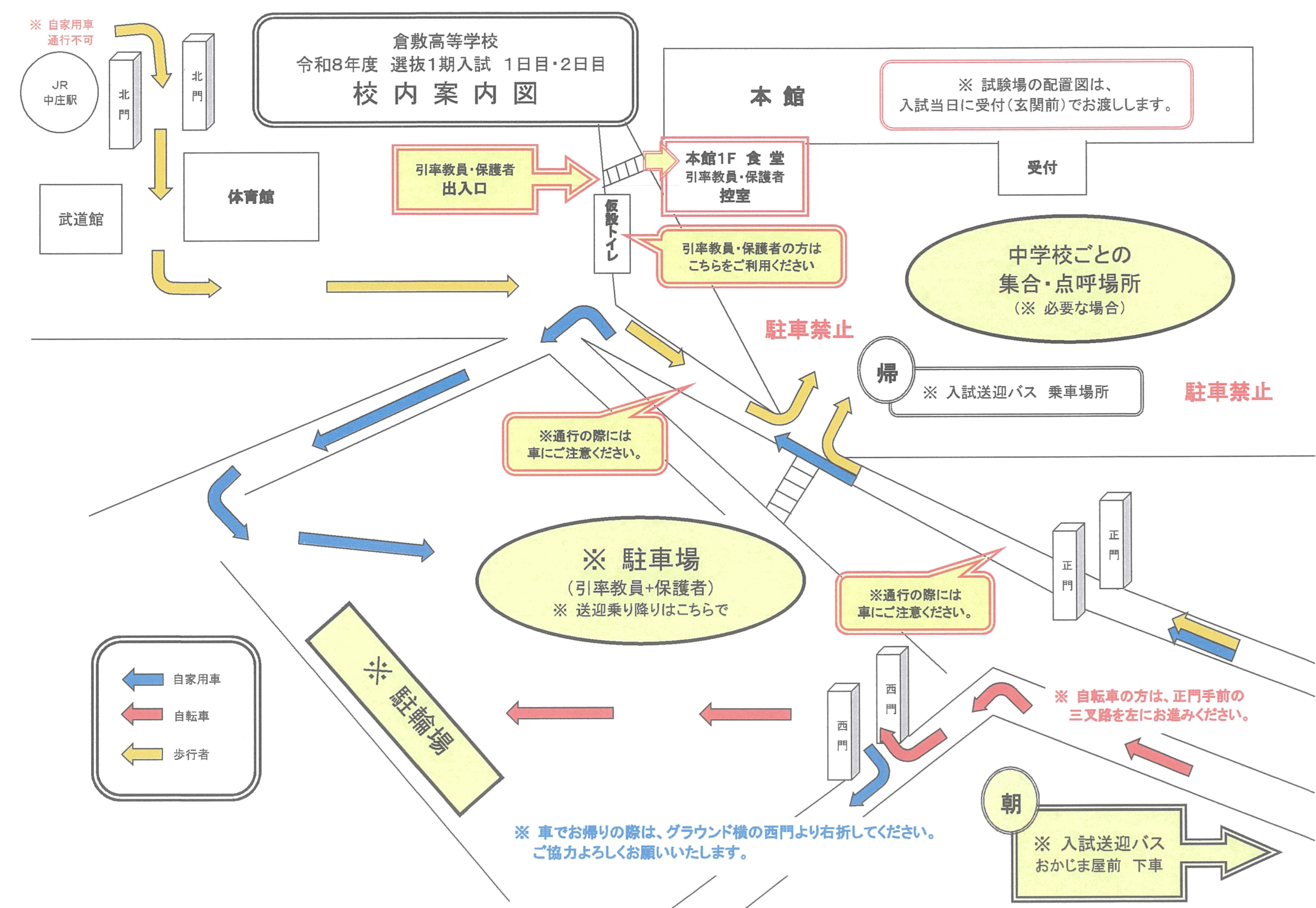 入学試験当日の自家用車、自転車、徒歩でのご来校に対しての道順および順路と駐輪場の位置についてご確認ください。なお保護者の方、引率教員の方が自家用車でご来校の際の駐車場を準備いたしておりますので係員の誘導に従い駐車をお願いいたします。入試当日は学校周辺道路が混雑することがあります。時間に余裕を持ってご来校ください。また、自転車でご来校の際は学校周辺道路の道幅が狭くなっています。通行には十分ご注意ください。