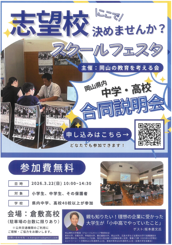 令和9年度高等学校入学に向けてスクールフェスタ(主催 岡山の教育を考える会)が倉敷高等学校を会場に実施されます。岡山地区、倉敷・総社地区の県立、私立高等学校および県立・私立中学校が多数参加します。中学生(小学生)のみなさんは各学校の教育活動(教育方針、学習活動、進路状況など)や入学試験についての最新の情報が得られます。受験対策は早いほうが良い!志望校決定に向けての第一歩はここから!主催は岡山県下の各学習塾です。受験のスペシャリストの全面バックアップがあることで安心して参加できます。中学生(小学生)のみなさん、保護者のみなさんのご来校をお待ち申しあげます。