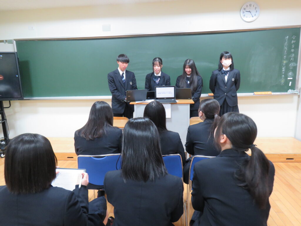 当日は、クラスメイトや教員の前で堂々と発表する姿が見られ、質疑応答の時間には活発な意見交換も行われました。発表を通して、自分の考えを伝える力や他者の意見から学ぶ姿勢を育む貴重な機会となりました。